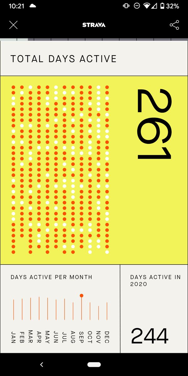 261 days active, almost 20 more than in 2020. Probably more like >300, because I don't track when I do yoga or lift at the gym.